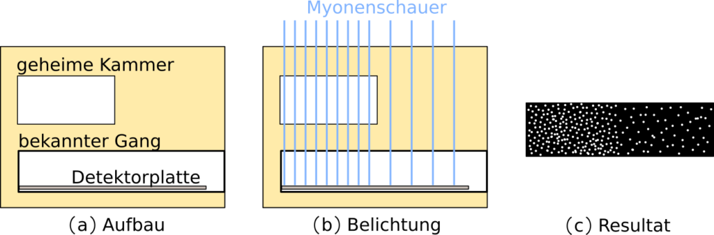 Nach Ablauf der Belichtungsphase zeigt Teilbild (c) schließlich das Ergebnis – im linken Bereich trafen deutlich mehr Myonen auf als im rechten, was auf einen über dem Gang liegenden Hohlraum schließen lässt.
