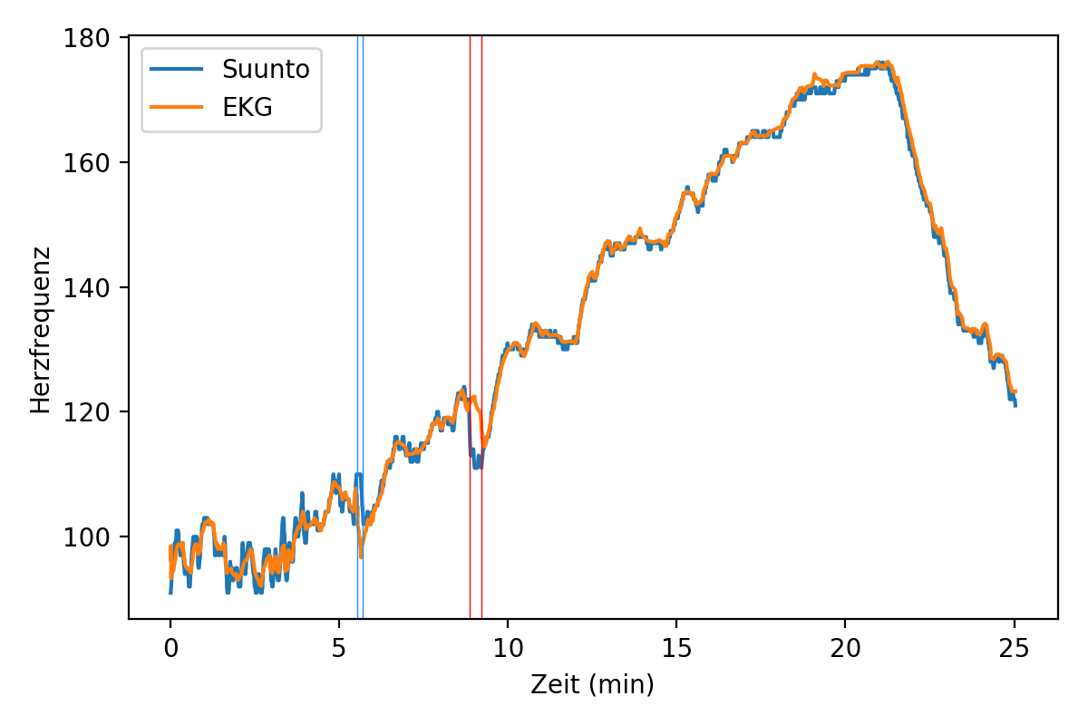 Schließlich kommt bei den EKG Daten noch ein weiterer Umstand hinzu. Die Messdaten hatte ich nicht elektronisch erhalten sondern ausgedruckt auf Papier. Ich habe diese dann digitalisiert und fehlerhafte Datenpunkte die durch die Digitalisierung entstanden sind entfernt. Die EKG Messung und die Suunto Sensor Messung beginnen nicht gleichzeitig und ich hatte im Nachhinein keine Möglichkeit einen gemeinsamen Startpunkt direkt zu finden. Allerdings konnte ich beide Kurven gegeneinander verschieben bis die Abweichungen minimal waren. Es scheint eine sinnvolle Annahme zu sein, dies so durchzuführen, lässt allerdings die Möglichkeit zu, dass die Suunto Herzfrequenzdaten vielleicht etwas verzögert aufgenommen werden. Dies kann ich mit obiger Analyse also nicht feststellen, ändert aber nichts an den anderen Resultaten.